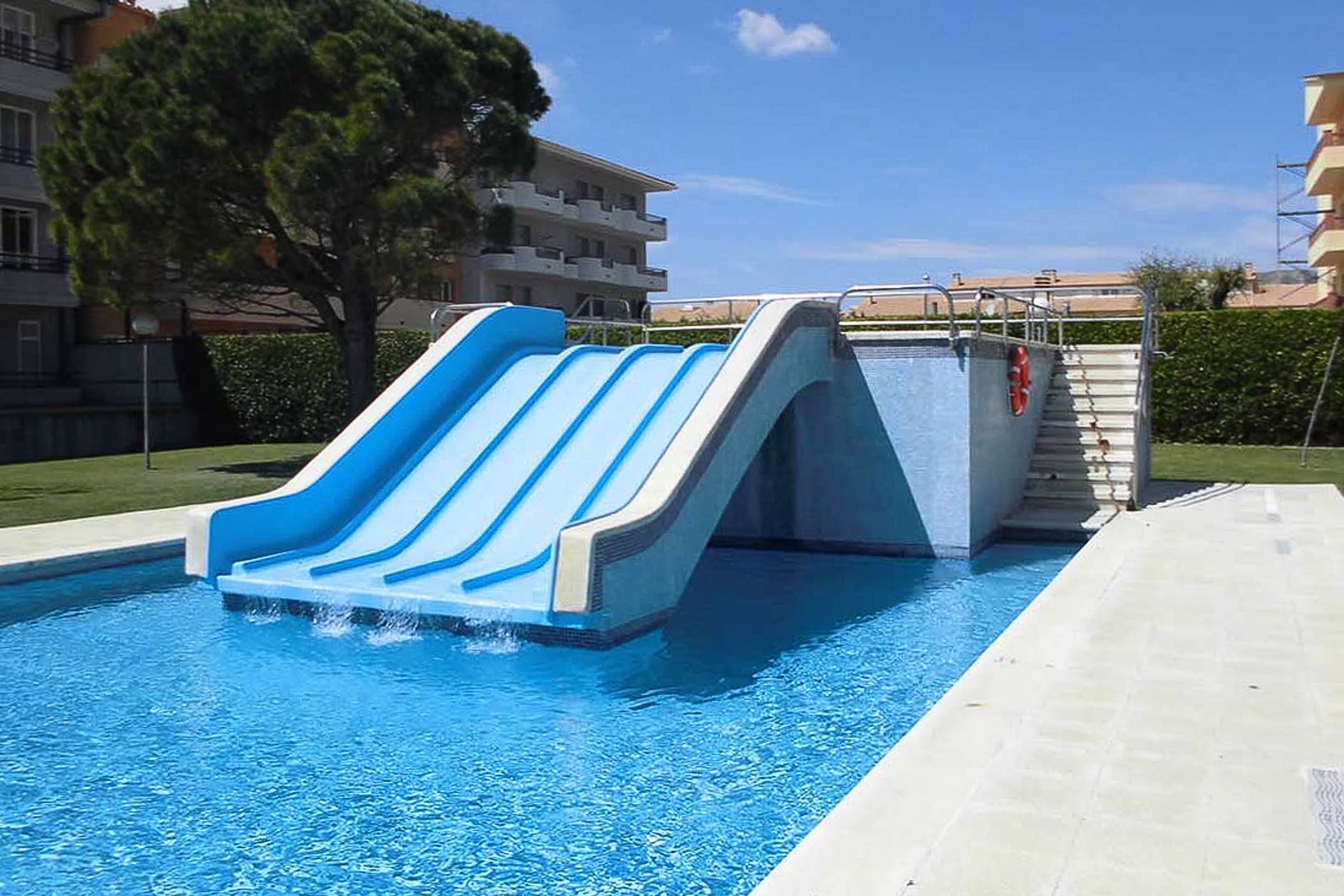 Apartment for 4 people on the third floor of a four-storey building. Large garden and community pool with slides, family atmosphere. One bedroom with 2 single beds, and there is a sofa bed (made up of 2 single beds) in the living room. Open kitchen, bathroom and balcony facing the street. Refrigerator, microwave, cutlery, crockery, cooking utensils, washing machine.