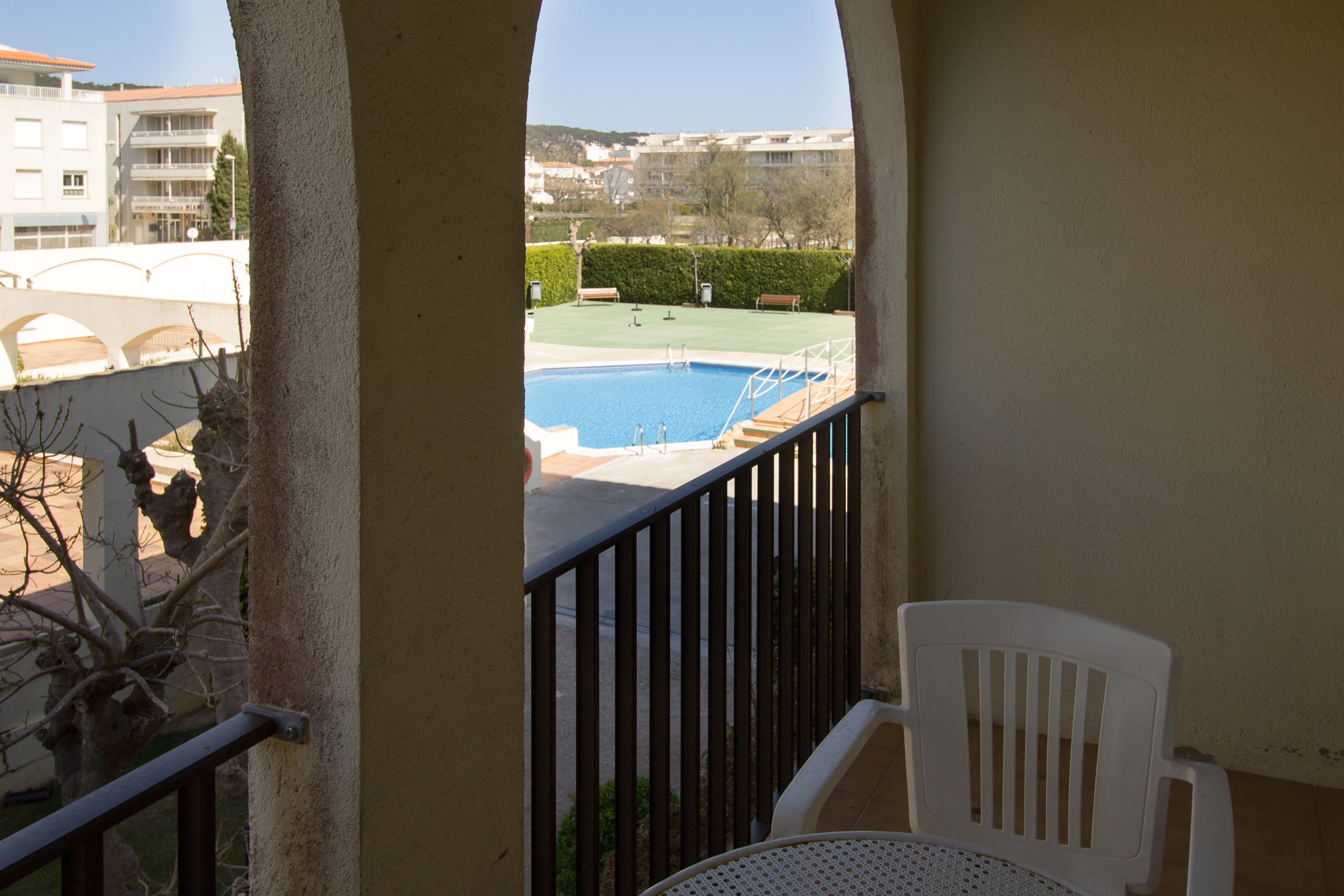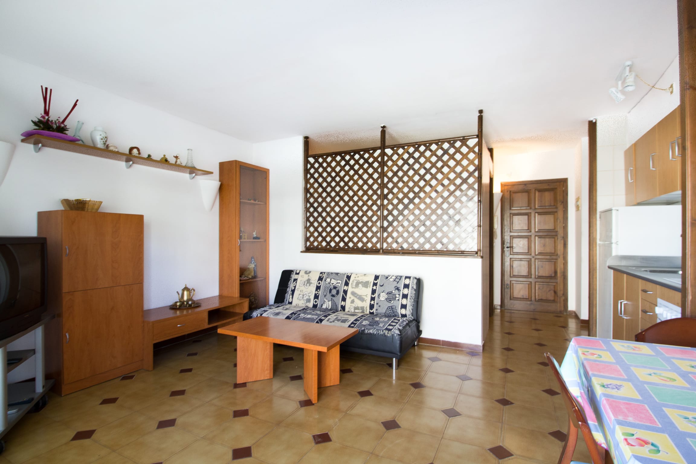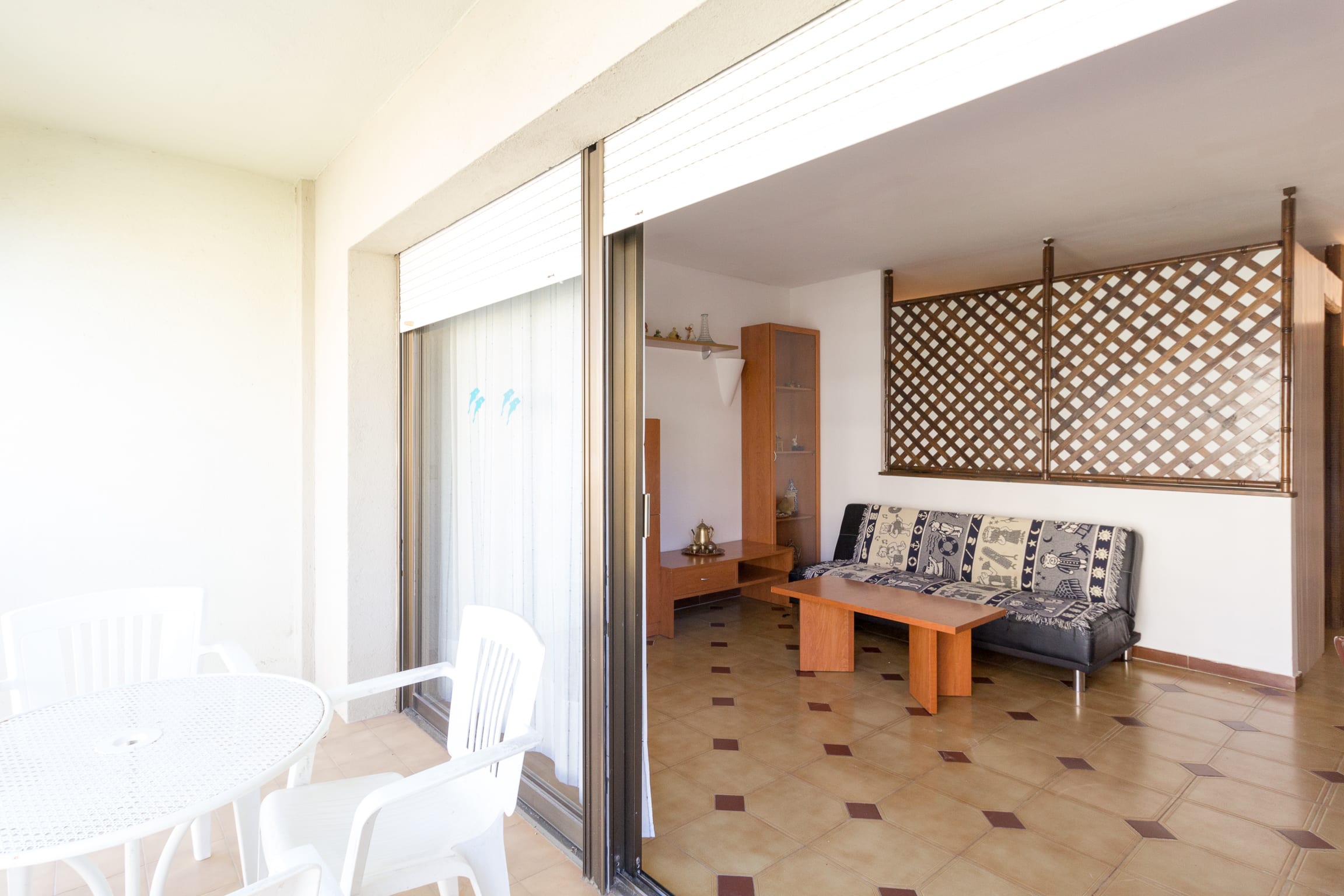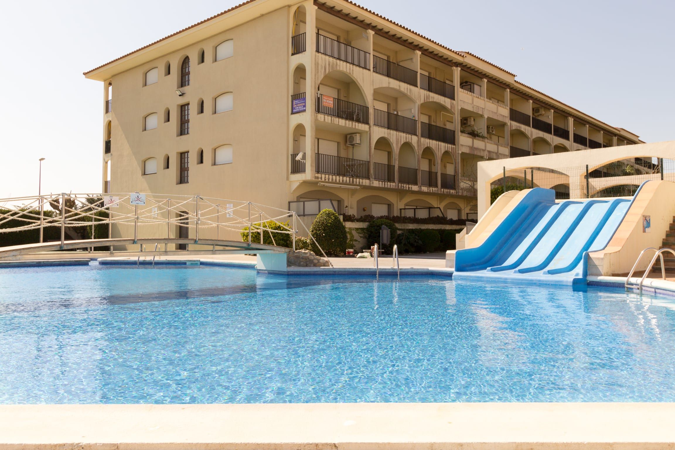 Lovely apartment for 6 in Jardins del Mar residential complex with 3 swimming pools and slides, surrounded by a garden with a lake. The apartment has 1 bedroom with double bed, 1 bedroom with bunk beds, and there is a sofa-bed in the living room. Lovely terrace overlooking the garden is a perfect place to relax after a hot summer day. The apartment is equipped with TV, washing machine, microwave, and the building has a lift and speakerphone.