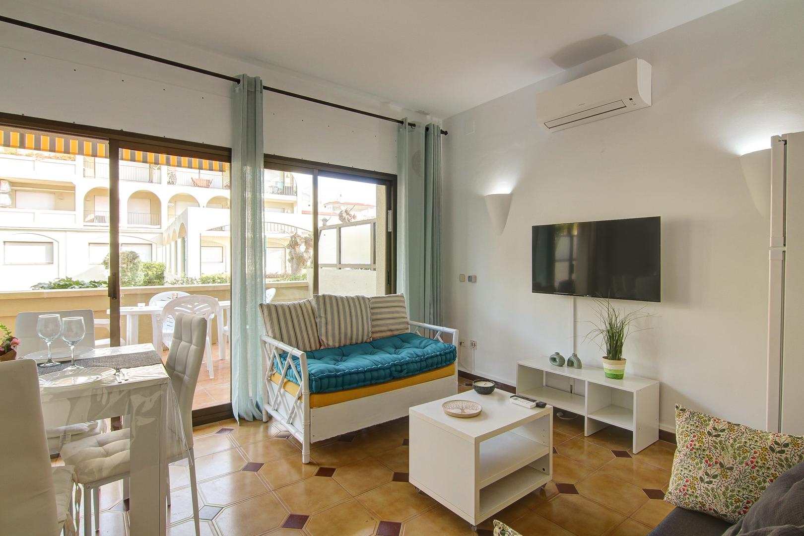Apartamento para 4-6 personas con aire acondicionado, reformado con piscina y toboganes, jardín y parking. Planta baja con terraza frente al jardín comuniatario. Equipado con TV, lavadora, lavavajillas, microondas. Bonito jardín comunitario con lago, piscina comunitaria con toboganes y 3 piscinas, interfono, ascensor, parking exterior cerrado comunitario. Playa a 450 m. Servicios a 100 m: supermercado, panadería, carnicería. Centro del pueblo a 450 m. Edificio con ambiente familiar con niños.