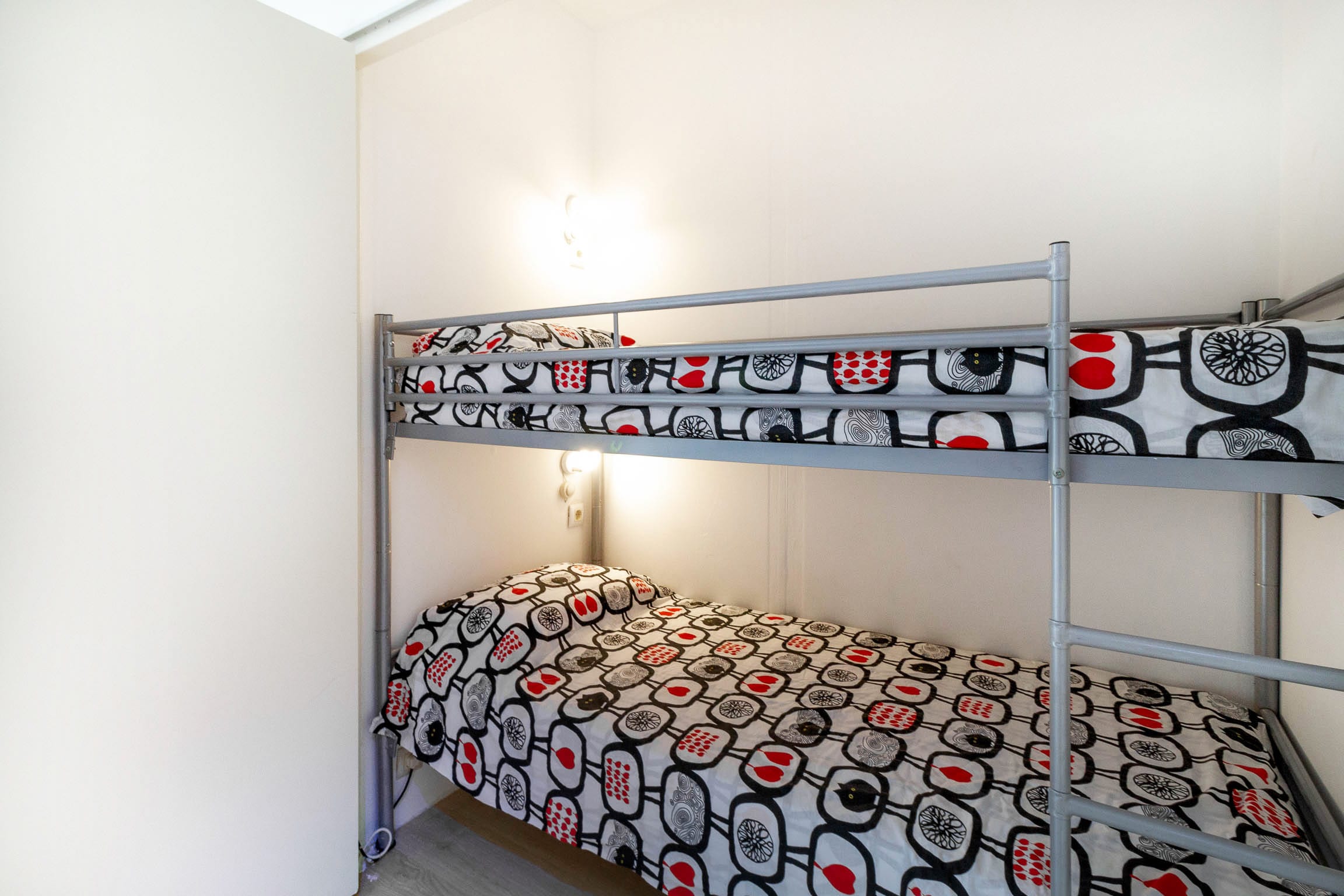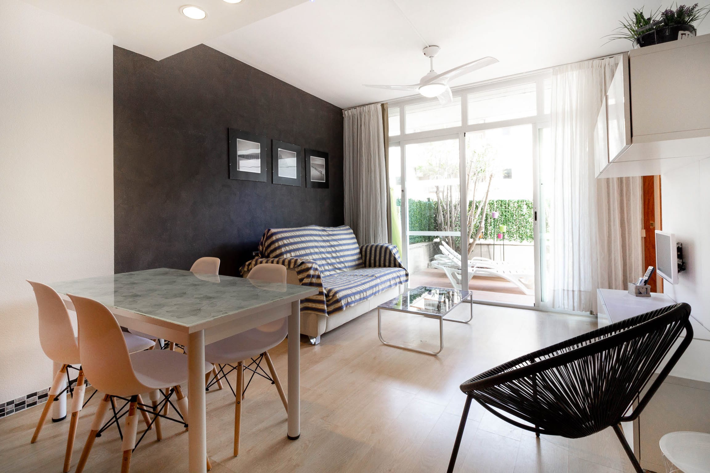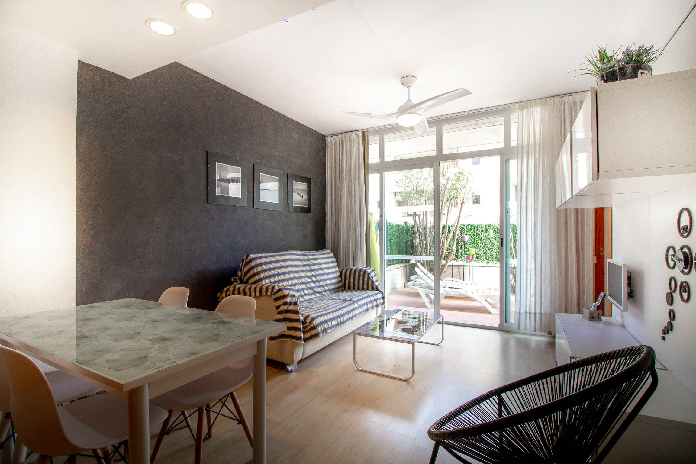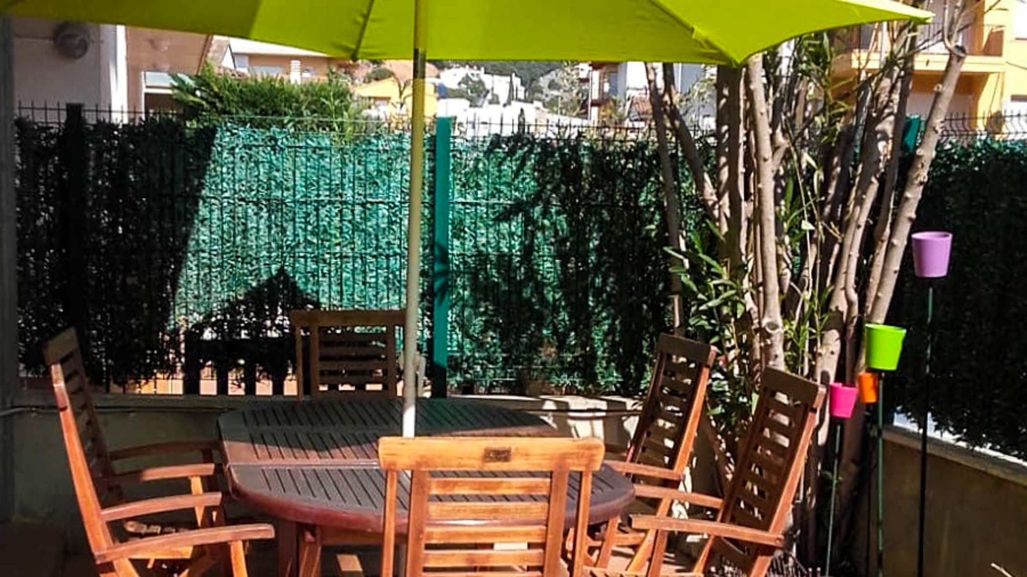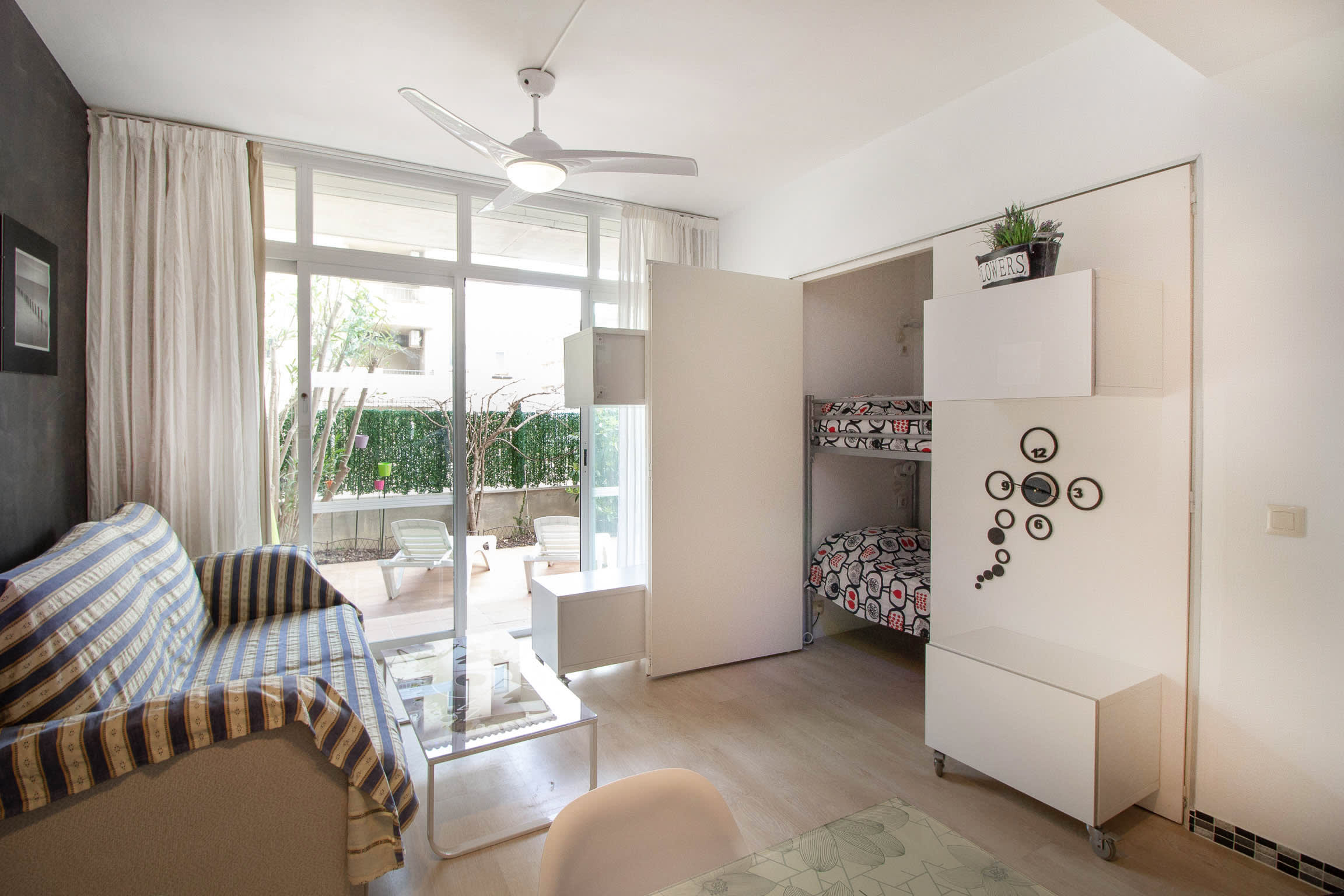 Apartamento con terraza-jardín privado, moderno y bien equipado para un máximo de 4 personas en el complejo residencial Miami con piscina comunitaria. El apartamento tiene 1 dormitorio con cama de matrimonio, un sofá cama y una litera en la sala de estar. El jardín privado de 15m2 equipado con mesa, sillas, tumbonas y una canasta de basquet es el lugar ideal para relajarse.