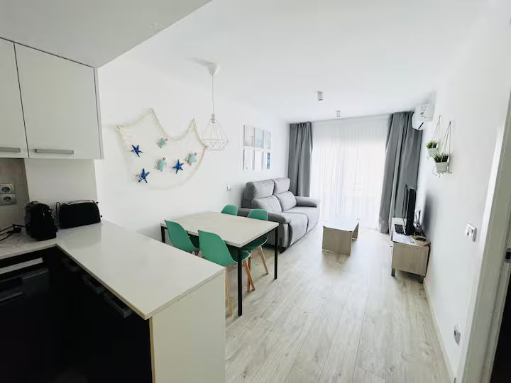 Apartamento recién reformado con terraza, piscina comunitaria y bien equipado para un máximo de 4 personas. Consta de una habitación doble (dos camas individuales 90 x 190) y un sofá cama en el comedor (matrimonio 150 x 180). El apartamento dispone de TV, lavadora, microondas, horno, vitrocerámica, cafetera, vajilla y utensilios de cocina. La playa está a 250 metros, o 4 minutos a pie. Apartamento de vacaciones ideal para familias con niños. No se aceptan mascotas