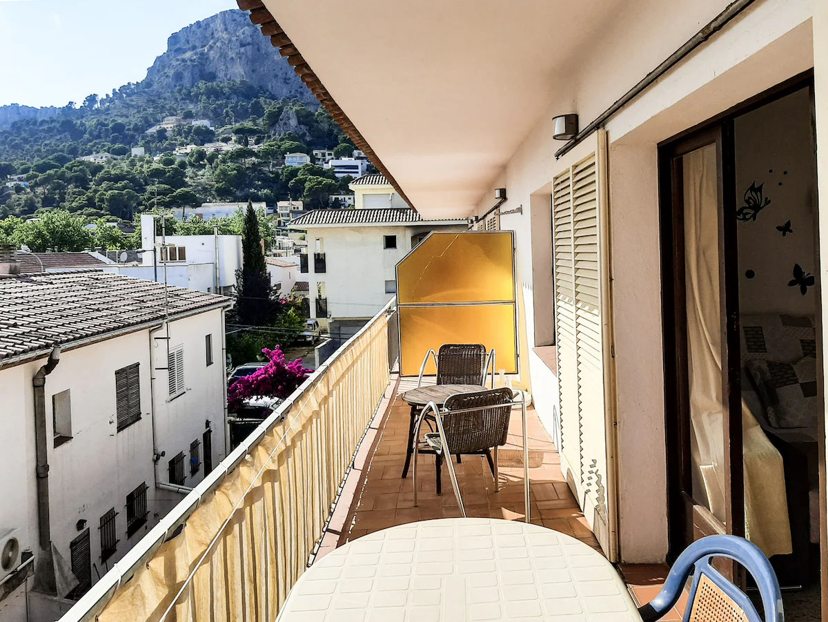 Apartament amb dos dormitoris (un amb 3 llits individuals i l’altre amb 2 llits individuals), una cuina independent amb cuina a butà, un bany amb banyera i una àmplia sala d’estar amb accés a una gran terrassa. Rentadora comunitària a l'edifici de la planta baixa. És un apartament senzill però té tot el necessari per passar unes bones vacances: l’apartament és al centre de l’Estartit i la platja és a uns 2 minuts a peu.