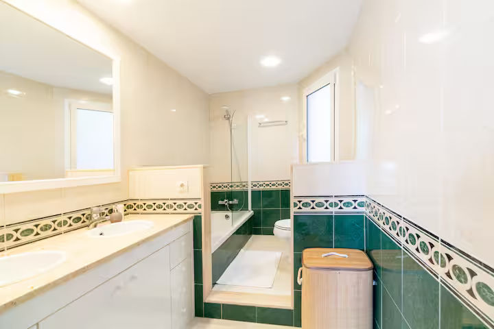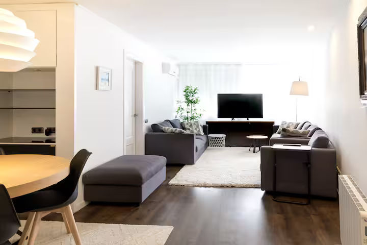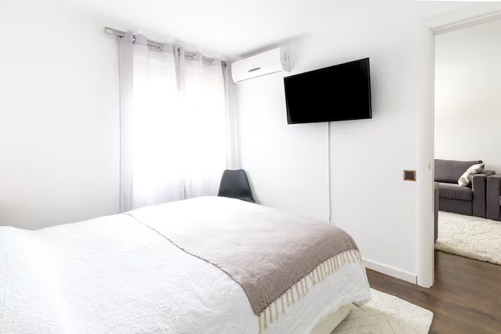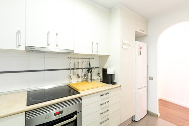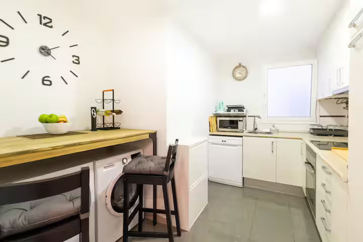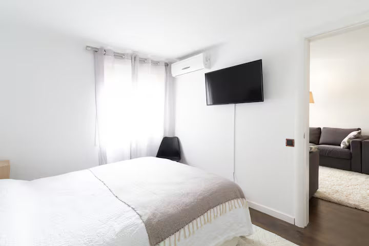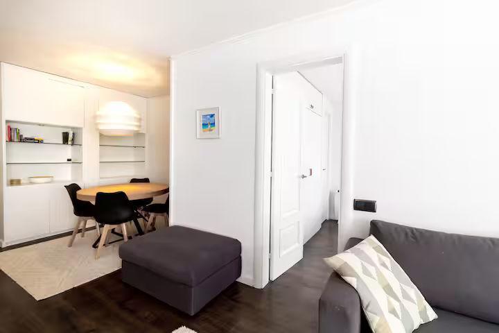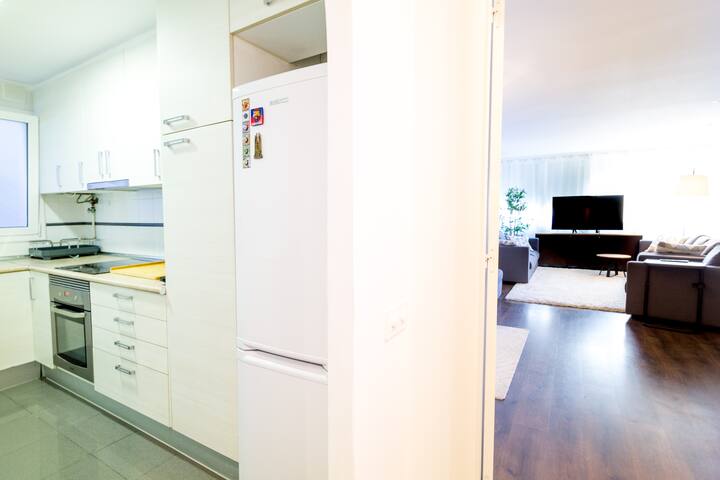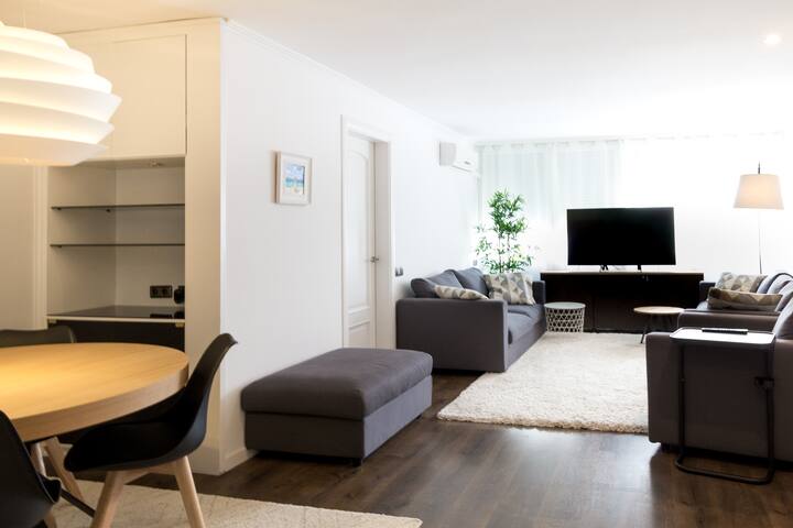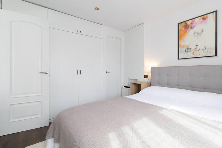 BarcelonaPis totalment equipat, cèntric i còmode de 2 dormitoris i 2 banys a 6a planta d´un edifici tranquil amb conserge. Dos dormitoris en suite, cadascun amb bany propi, un amb banyera i un altre amb dutxa. La cuina està equipada amb rentadora, assecadora, rentavaixelles, microones, forn, nevera amb congelador, sandvitxera, tetera, cafetera, vaixella, etc. Roba de llit i tovalloles incloses. Planxa per a roba, aire condicionat, radiadors elèctrics. Neteja de 3 hores cada 2 setmanes inclosa en el preu.