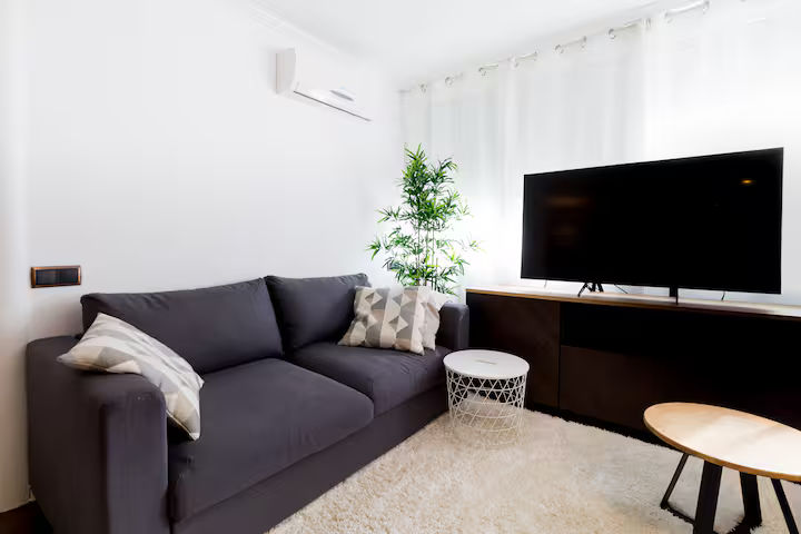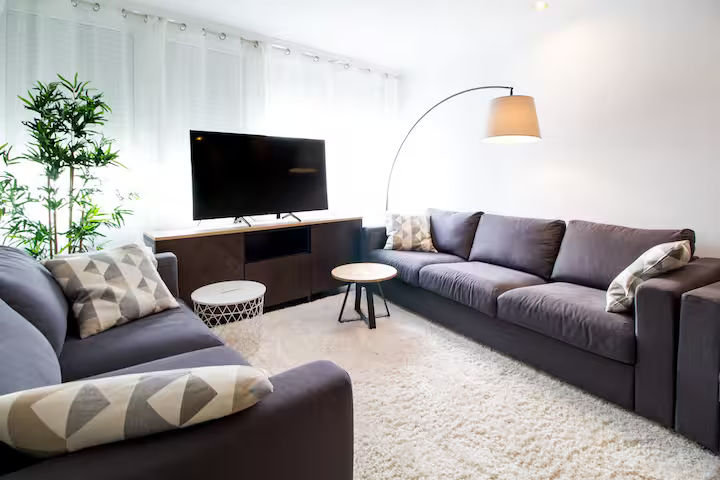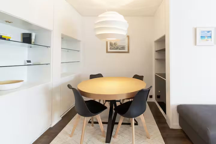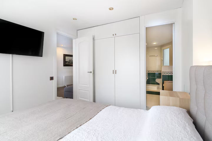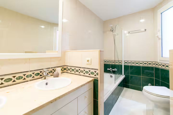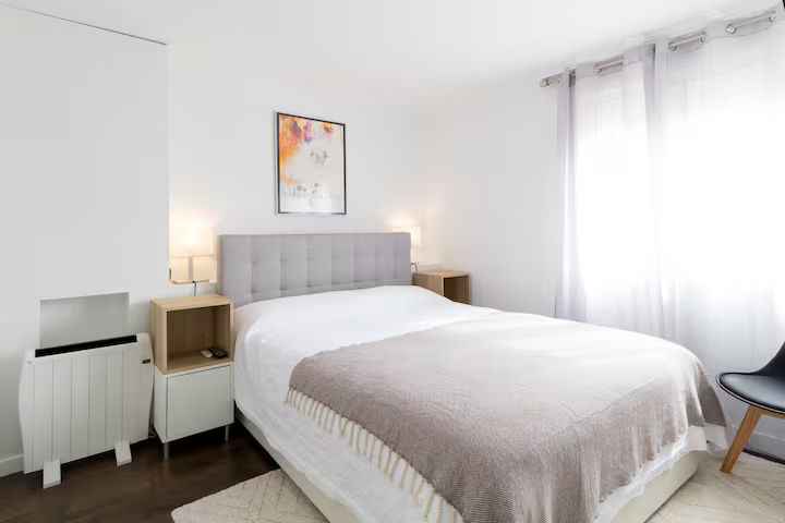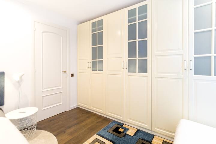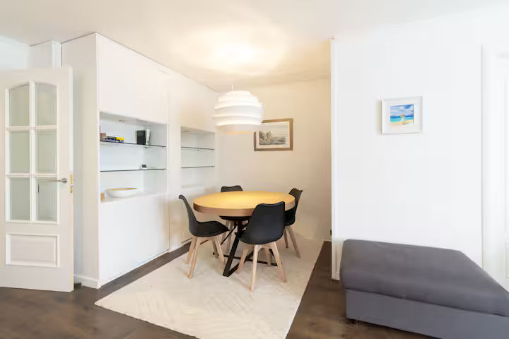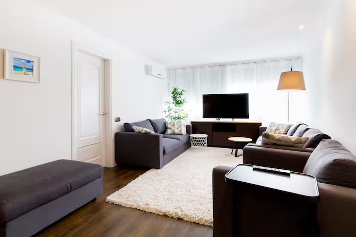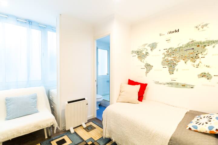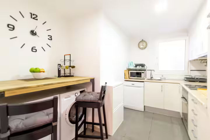 BarcelonaPis totalment equipat, cèntric i còmode de 2 dormitoris i 2 banys a 6a planta d´un edifici tranquil amb conserge. Dos dormitoris en suite, cadascun amb bany propi, un amb banyera i un altre amb dutxa. La cuina està equipada amb rentadora, assecadora, rentavaixelles, microones, forn, nevera amb congelador, sandvitxera, tetera, cafetera, vaixella, etc. Roba de llit i tovalloles incloses. Planxa per a roba, aire condicionat, radiadors elèctrics. Neteja de 3 hores cada 2 setmanes inclosa en el preu.
