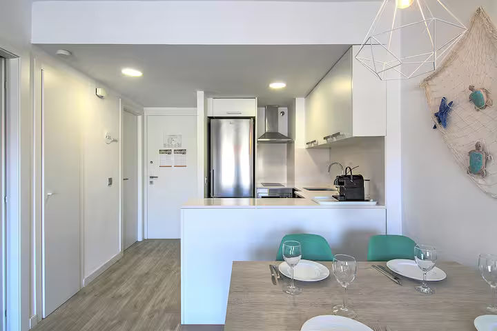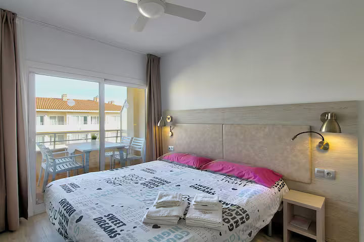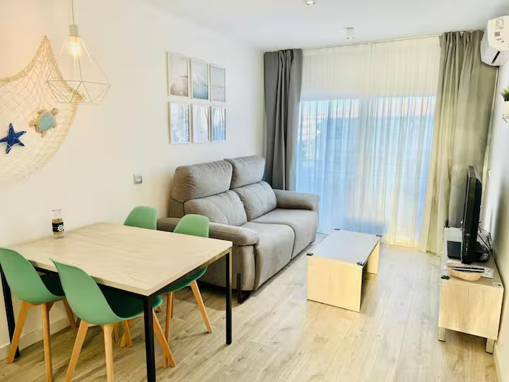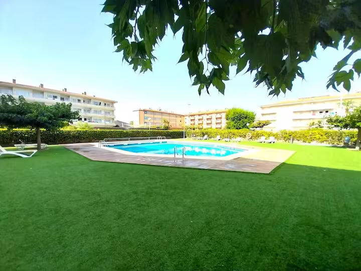 Apartament acabat de reformar amb terrassa, piscina comunitaria i ben equipat per a un màxim de 4 persones. Consta d'una habitació doble ( dos llits individuals 90 x 190) i un sofà llit al menjador (matrimoni 150 x 180) L'apartament disposa de TV, rentadora, microones, forn, vitroceràmica, cafetera, vaixella i utensilis de cuina. La platja és a 250 metres, o 4 minuts a peu. Apartament de vacances ideal per a famílies amb nens. No s'accepten mascotes.