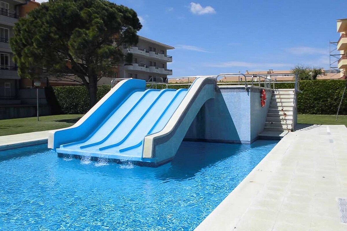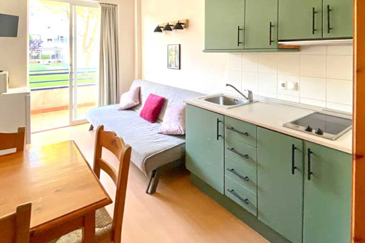Apartment on the ground floor of the Blaupark building in Estartit with shared pool and garden at 450m from the beach (9 min on foot). The apartment has one bedroom with 2 single beds, living room with sofa bed, bathroom and small terrace overlooking the garden and pool. Open plan kitchen. It has Wifi and it's equipped with TV, refrigerator, microwave. The building has a lift. Family atmosphere.