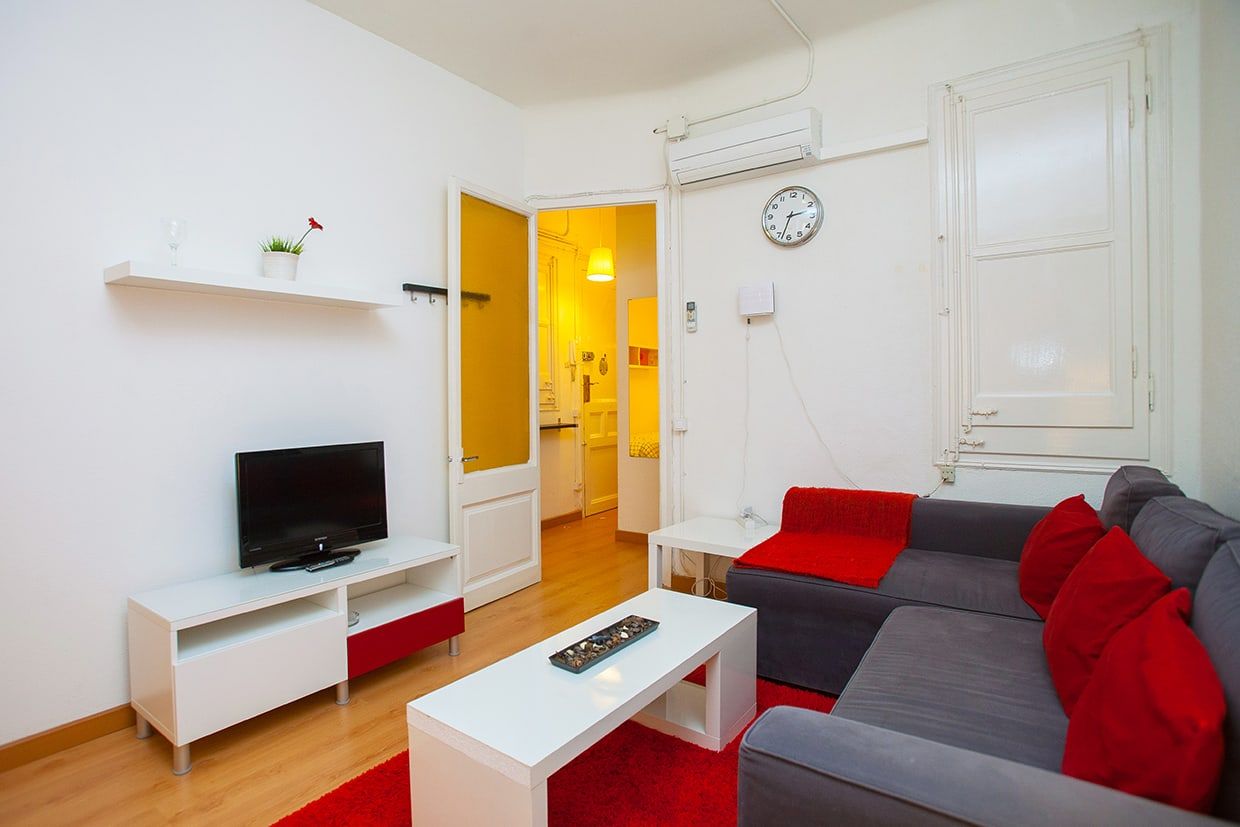 BarcelonaPerfectly located at a few steps from Sagrada Familia, this apartment is rented on monthly basis (minimum stay one month) and it can accommodate up to 3 people. One double and one single bedroom, small bathroom with shower, well equipped kitchen and a living room with sofa, dining table, TV and air-conditioning. It's equipped with washing-machine, fridge, microwave, oven, toaster, kettle, pots, pans, plates and cutlery.