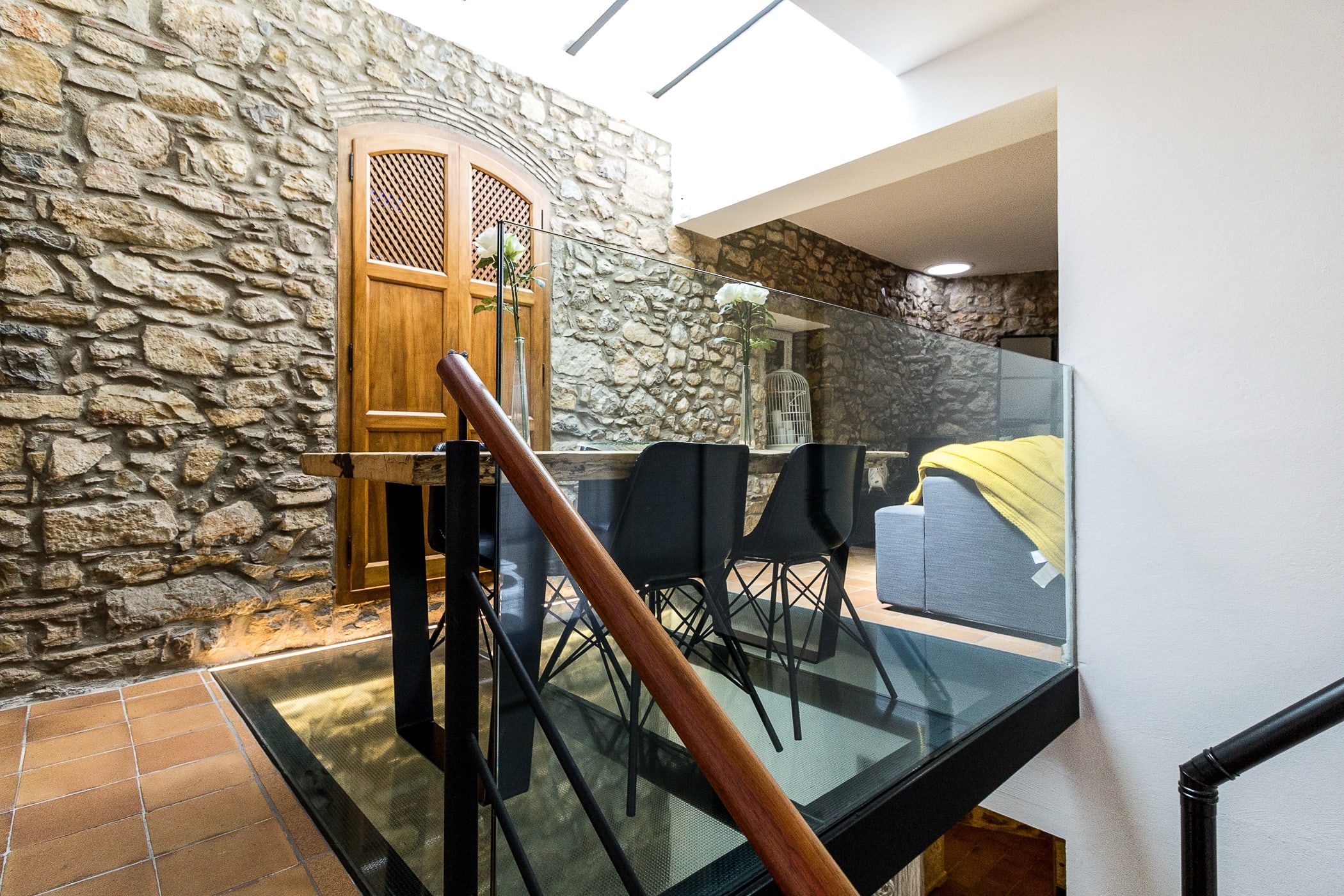 La casa es distribueix en 3 plantes: a la planta baixa hi trobem un rebedor, un lavabo i una espaiosa sala de dutxa, una sala d'estar i una encisadora habitació doble amb pared de pedra. A la primera planta hi ha la cuina espaiosa totalment equipada, la zona de menjador sobre una espectacular plataforma de vidre i una sala d'estar gran amb llar de foc i televisió. A la segona planta trobem 2 dormitoris, una suite doble amb banyera i una habitació triple amb televisió, un wc amb rentadora i assecadora i unes escales de cargol per accedir al chillout de la terrassa. Aquesta consta d'una zona de picnic amb gespa artificial, tombones i una dutxa per refrescar-se. Està equipat amb un espai de cuina senzilla amb parament de la llar, cafetera i microones amb grill. És ideal per vacances d estiu, turisme cultural i gastronòmic, ja que disposa de totes les comoditats.