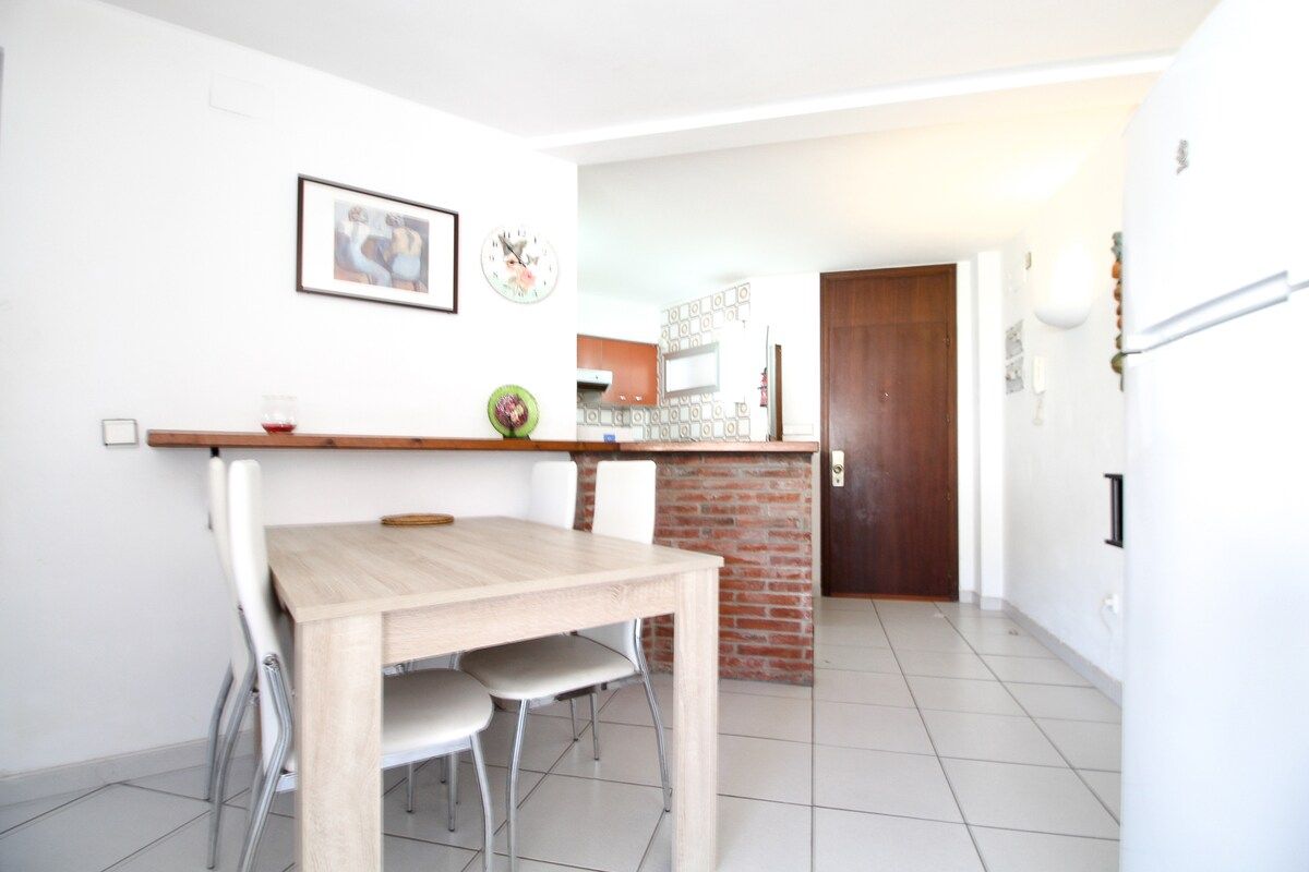 Apartament cèntric amb jardí i piscina a 3 minuts a peu de la platja de sorra. L'apartament té 1 dormitori doble, 1 dormitori amb lliteres, sala d'estar amb sortida a la terrassa amb vistes al jardí. La cuina està equipada amb nevera, microones, rentavaixelles, estris de cuina. Bany amb banyera. L'edifici Medes disposa d'ascensor, conserge, gran jardí i piscina. Està perfectament situat per a unes vacances d'estiu al centre d'Estartit i a només 3 minuts a peu de la platja.
